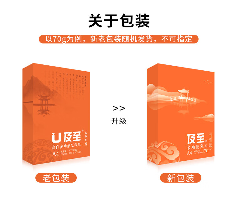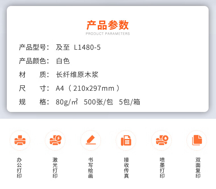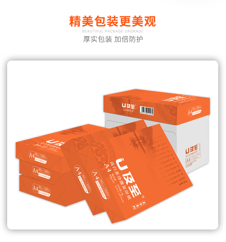 商品名称:及至 L1480-5 橙及至复印纸 A4 80g 500张/包*5包/箱 单位:箱