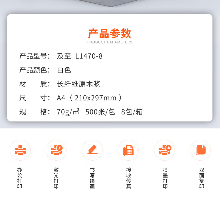 商品名称:及至 L1470-8 橙及至复印纸 A4 70g 500张/包*8包