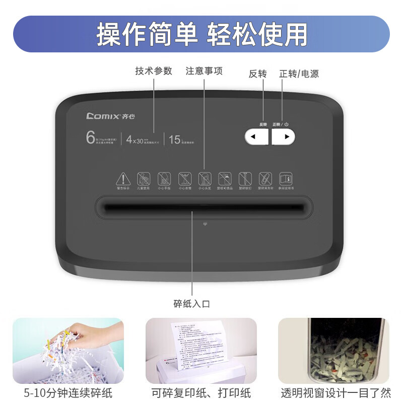 商品名称:齐心 4级保密碎纸机 办公小型 家用迷你 文件粉碎机( 单次6张 持续5分钟 15L 可碎纸/文件) S2206