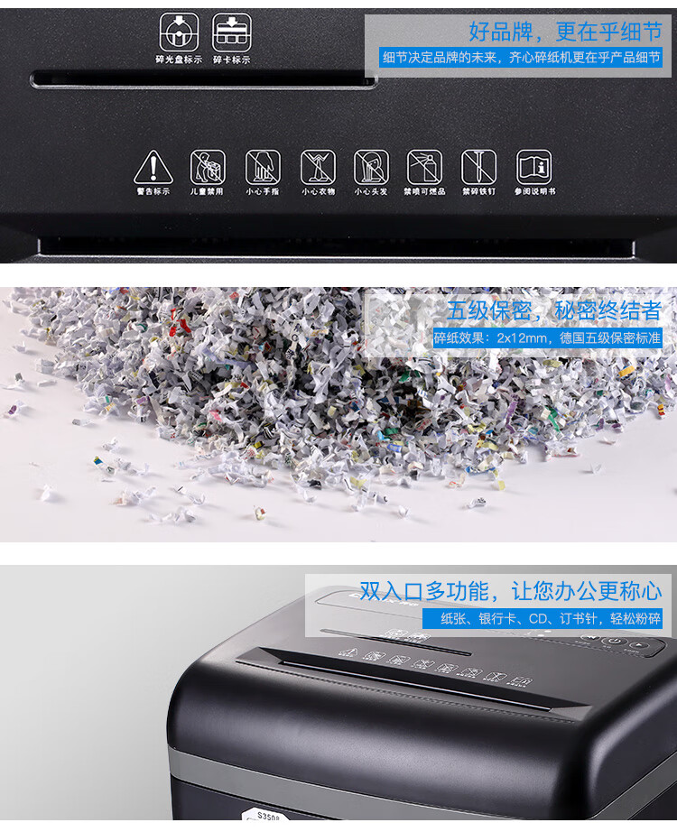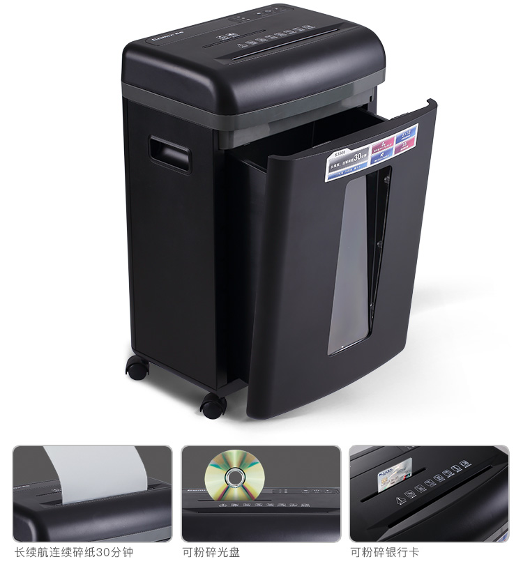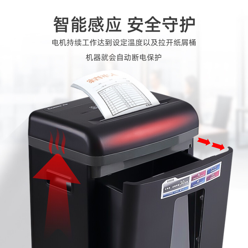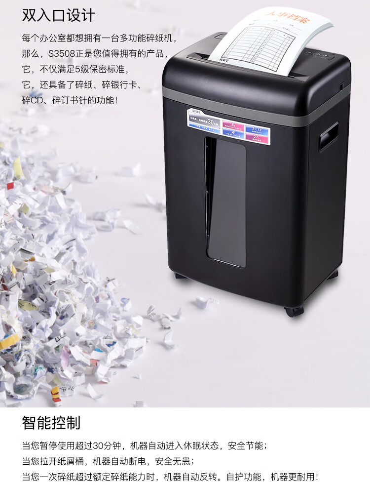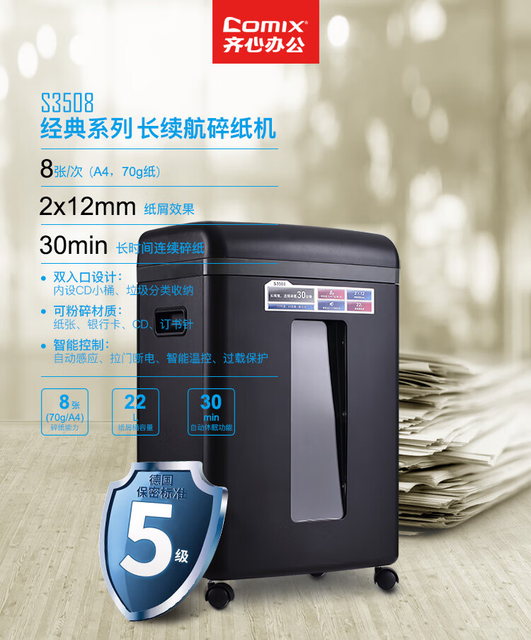 商品名称:齐心 5级保密碎纸机 办公商用家用文件粉碎机(单次8张 持续碎纸30分钟 双入口可碎纸/卡/光盘) S3508