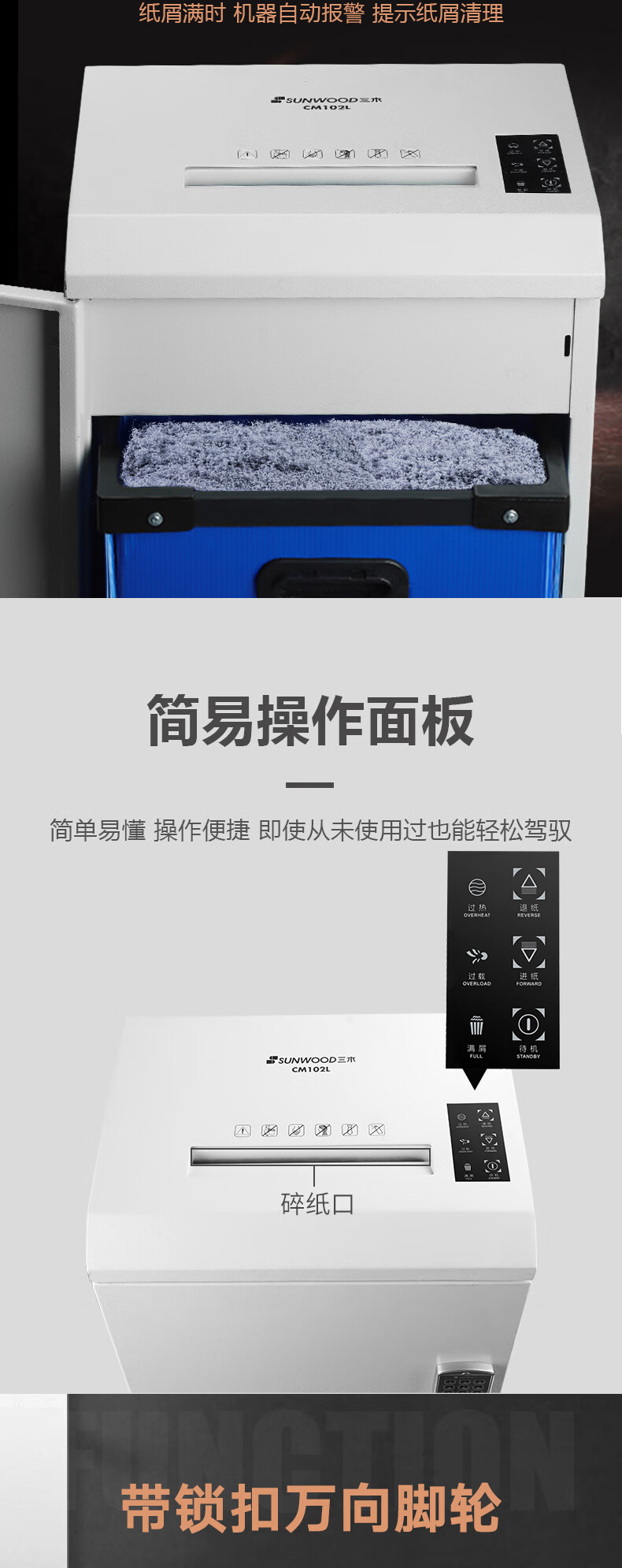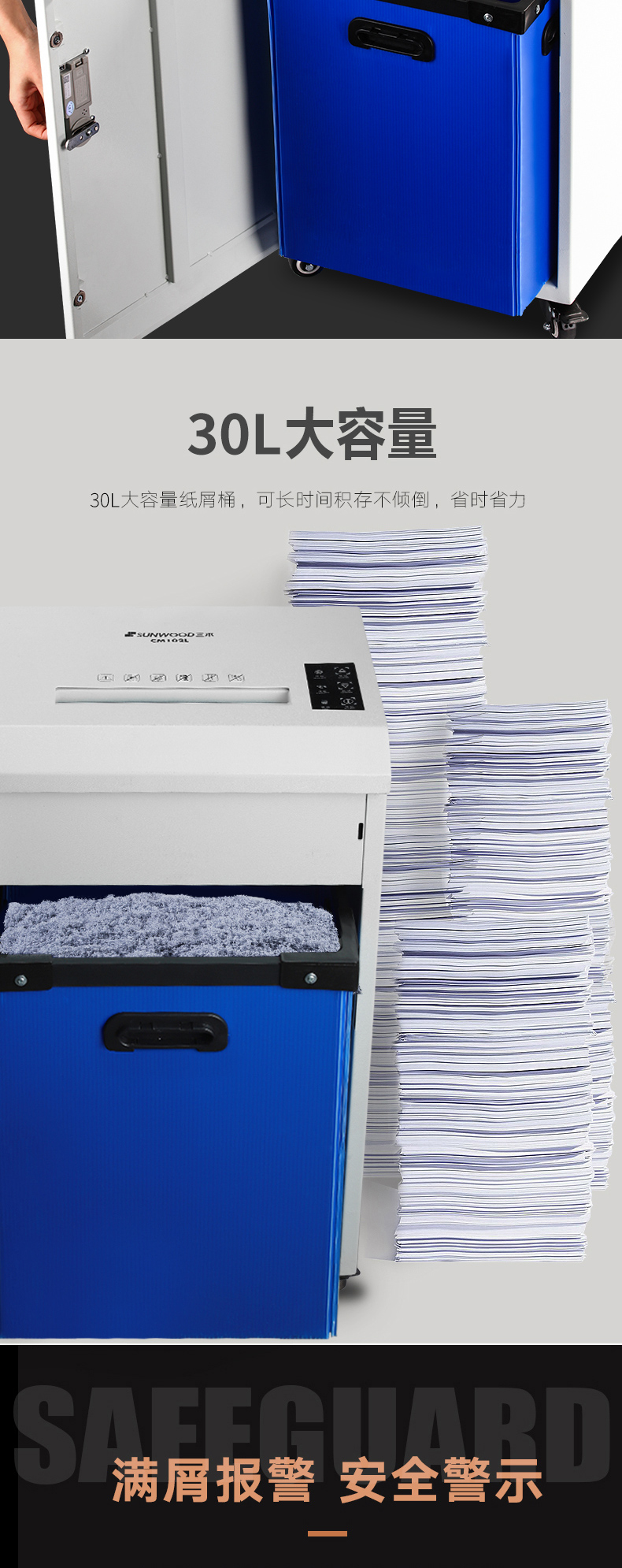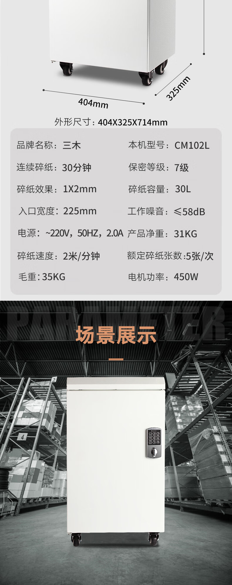 商品名称:三木(SUNWOOD)7级保密专业销毁碎纸机带密码锁(单次5张 持续30分钟 30L 可碎纸) CM102L