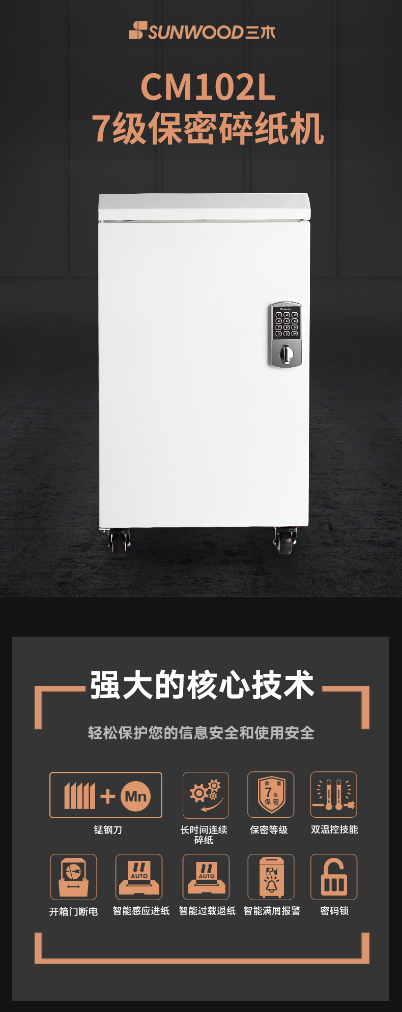 三木(SUNWOOD)7级保密专业销毁碎纸机带密码锁(单次5张 持续30分钟 30L 可碎纸) CM102L
